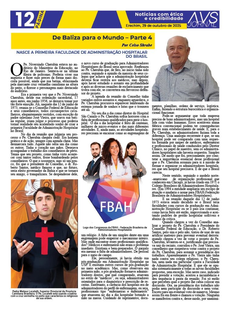 Era a primeira vez que o Pe. Niversindo Cherubin, desde sua ordenação sacerdotal, 17 anos antes, em junho 1956, se deixava tomar por tão forte emoção. Ali, naquele dia 12 de junho de 1973, reunia-se o Conselho Federal de Educação e seus conselheiros, todos circunspectos cavalheiros, elegantemente vestidos, com exceção do padre salesiano José Vieira, que usava sua batina regular, iriam julgar o processo que poderia tornar realidade seu acalentado sonho de criar a primeira Faculdade de Administração Hospitalar no Brasil