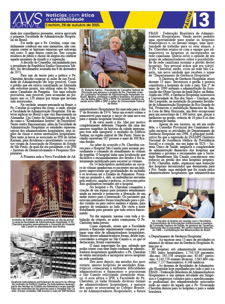 As dezenas de faculdades de Administração Hospitalar hoje espalhadas por todo o país e a FBAH – Federação Brasileira de Administradores Hospitalares e sua intensa atividade em Simpósios e Congressos voltados para o aperfeiçoamento profissional dos administradores associados estão no centro do legado que o Pe. Niversindo Cherubin deixou para os hospitais e para a saúde brasileira.